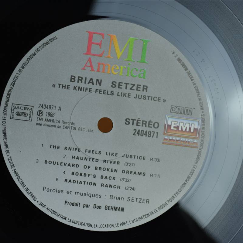 Disque vinyl 33T de Brian Setzer , « The knife feels like justice » de 1986.